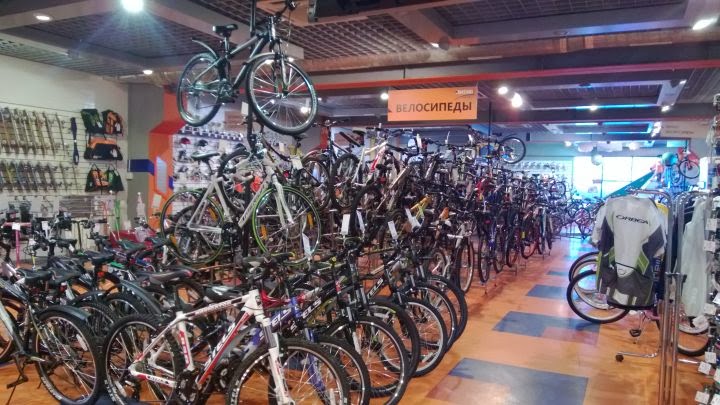 Витрина явно с новыми кроссовками. Велосипеды российского производства. Веломастерская с мастером, не разбирающимся в велосипедах. Короче все для тебя, несведущий лох. Покупай неликвид. Налетай.