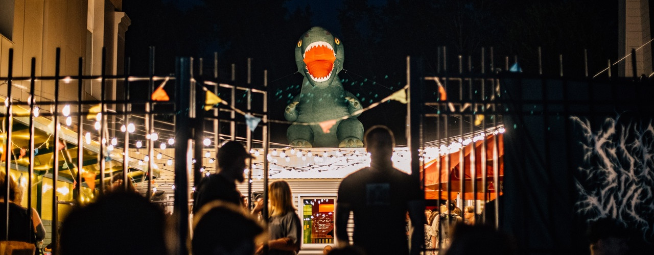 Ориентир — огромный зелёный Крутозавр на крыше, но адрес мы тоже напишем: Воронеж, ул. Пушкинская, 11б